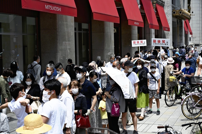 Famous Japanese Mitsukoshi department stores reopened Saturday, the first day following the lifting of the coronavirus related state of emergency in the Tokyo metropolitan area. Long lines of visitors awaited the opening outside of Nihombashi Mitsukoshi Main Store in Chuo Ward, Tokyo, which reopened for the first time in a month and a half.