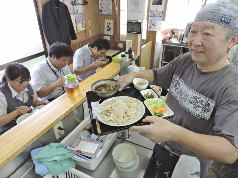 "We use flour with wheat bran, so our noodles are not pure white like Sanuki udon," said manager Wataru Ono, 64. The thick noodles take precisely 14 minutes and 30 seconds to cook, he added. One serving is quite filling because the udon is slightly heavier than regular udon and comes with a side dish of vegetables, which the locals call "kate."
