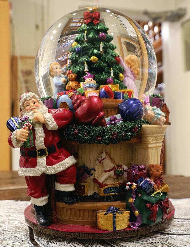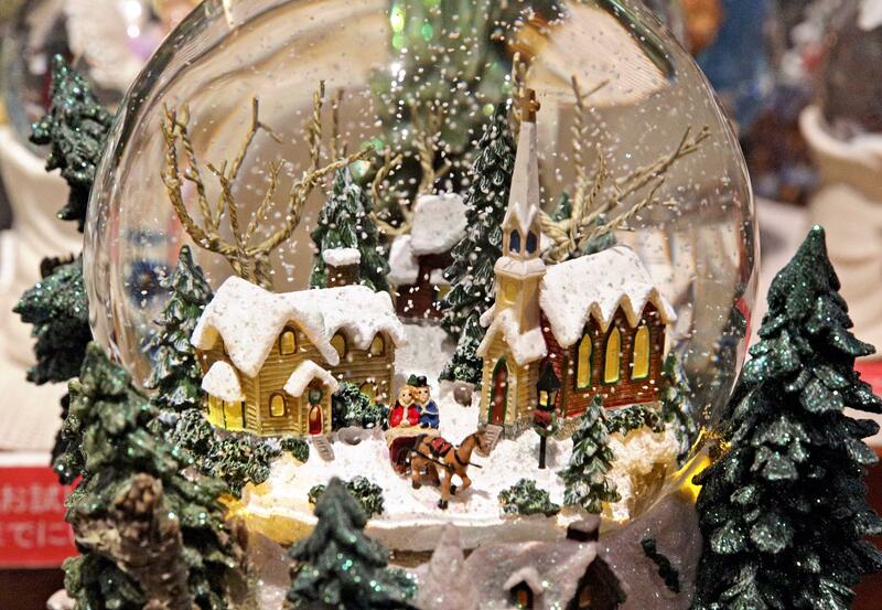 At the flick of an electrical switch, snowflakes begin whirling inside the dome, displaying a scene -- regardless of the actual season -- of snow falling on a path and rooftops.