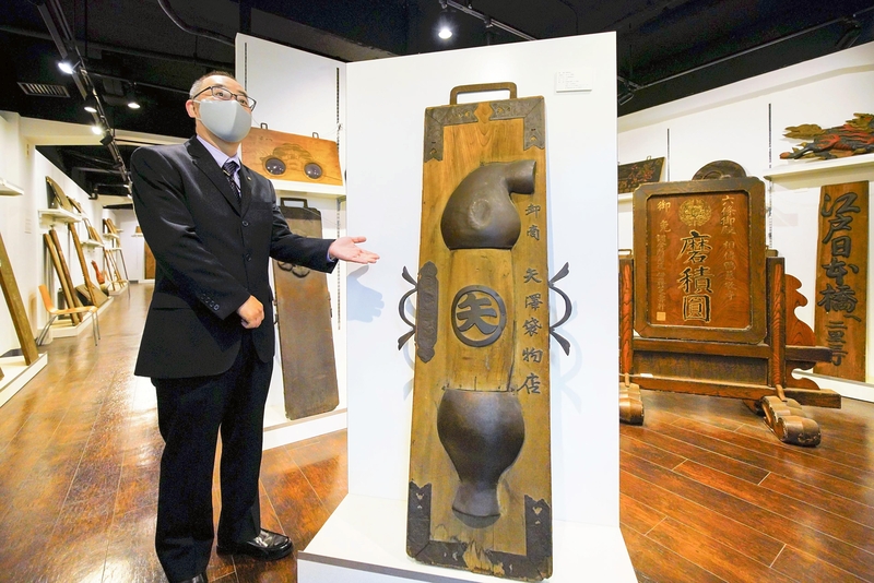 The Showa Neon Takamura Kamban Museum has kept its lineup of antique kamban signboards arranged the same way ever since the day it opened. The signs dating from the Edo period (1603-1867) to the beginnings of the Showa era (1926-1989) model goods for sale with cryptic creatures and the occasional clumsy lettering that bring out a retro feel, giving visitors the chance to look back into the olden days of advertising.