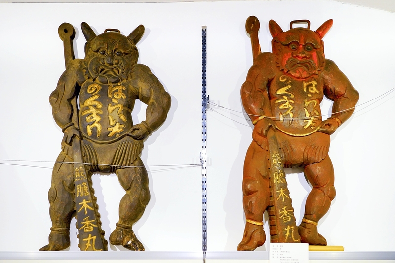 Medical products were also promoted by using bold imagery mixed with cultural references. The museum has two rather unpleasant-looking wooden ogres wielding a massive club each and the words "medicine for a stomachache" are scrawled across their stomachs. The medicine's name is inscribed on the clubs. A popular stomachache remedy in the Edo period was the dried gallbladder of a bear mixed with the dried roots of perennial daisy flowers. The totality of the cryptic imagery alludes to the Japanese "ogres using clubs" idiom, which means "adding power to something that's already powerful" and customers are left to themselves to figure out what it might mean.