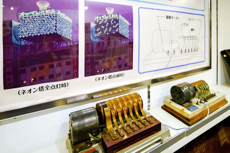 The museum also gives visitors the chance to look beyond signboards. On display is a mechanism that makes neon tubes glow. It has a roller with insulating bodies and copper sheets on it and it rotates with the same mechanisms as that of a music box. When a brush touches the copper sheet, it generates enough power to illuminate neon lights.