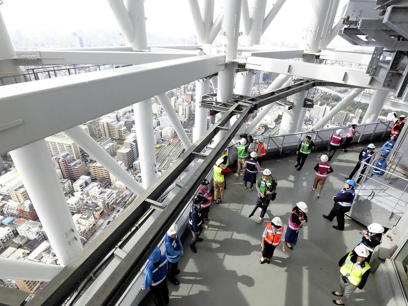 The open-air terrace at Tokyo Skytree tower in Sumida Ward, Tokyo, was unveiled to reporters on Tuesday, ahead of the Oct. 23 start of guided tours offering views of the Tokyo skyline from the terrace.