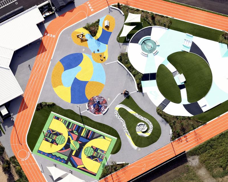 The 7,000-square-meter park is divided into six areas and includes an about 280-meter-long track and a basketball court. The color of each area is based on a motif from past Nike shoes.