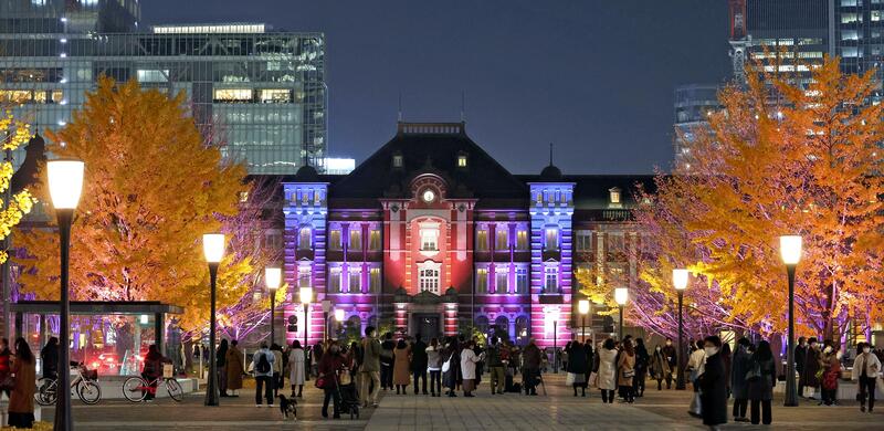 Visitors stand in the cool night air and take photos of Tokyo Station, as the famous building and the nearby trees are lit up in blue, purple and orange lights. The theme of the "Tokyo Michiterasu 2021" illumination is the dawn. The colors gradually change to represent the coming dawn of a new era. The illumination is set to run from 3 p.m. to 9 p.m. through Dec. 25.