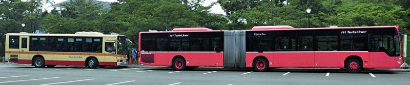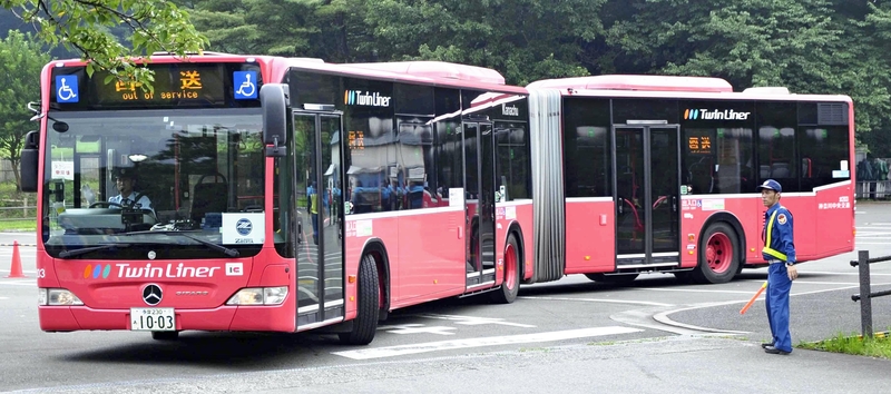 They look like two box cars connected like an accordian. Articulated buses, which are nearly twice the length of a common city bus, have been running on the streets of Machida, Tokyo, as public transport since 2012.