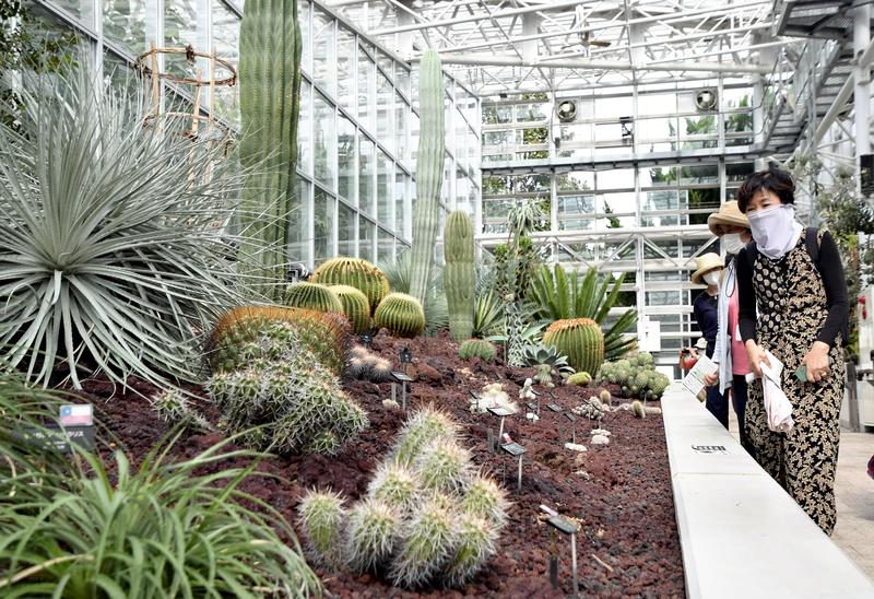 Also worth visiting in the greenhouse is the dryland plant room, where Chilean aurata cacti with thorns aplenty can be found. It is among the plants donated by Chile's national botanical gardens that signed a technical agreement with the Tokyo metropolitan government.