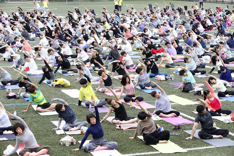 About 800 people do yoga at an event held on the outdoor athletic field of the Shibuya Sports Center in Tokyo on Thursday, the summer solstice. The United Nations proclaimed June 21 as the International Day of Yoga in 2014. The summer solstice is considered important in the world of yoga, in which high value is placed on harmony with nature.