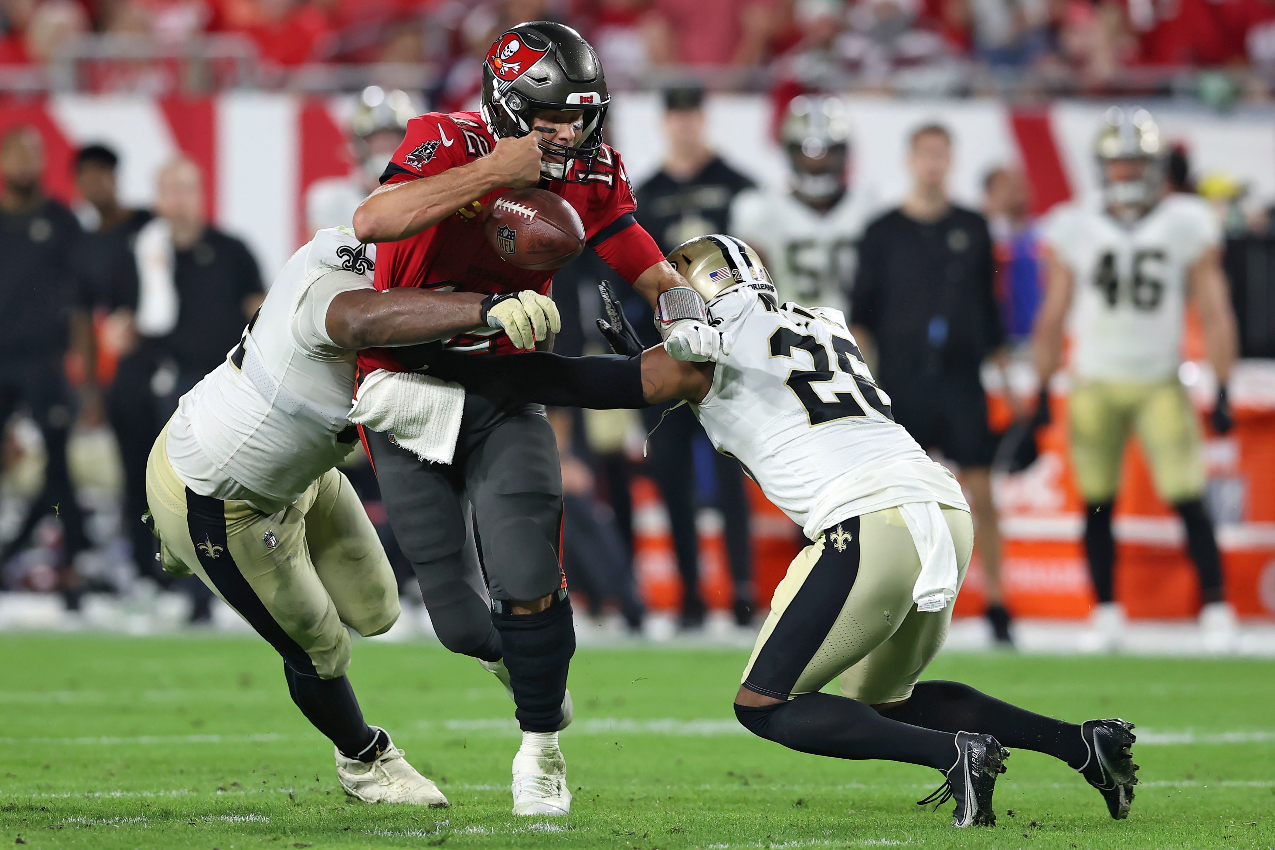 The seven-time Super Bowl winner turned the ball over twice and was sacked four times, while Tampa’s star running back Leonard Fournette and key wide receivers Chris Godwin and Mike Evans all suffered injuries during the game.