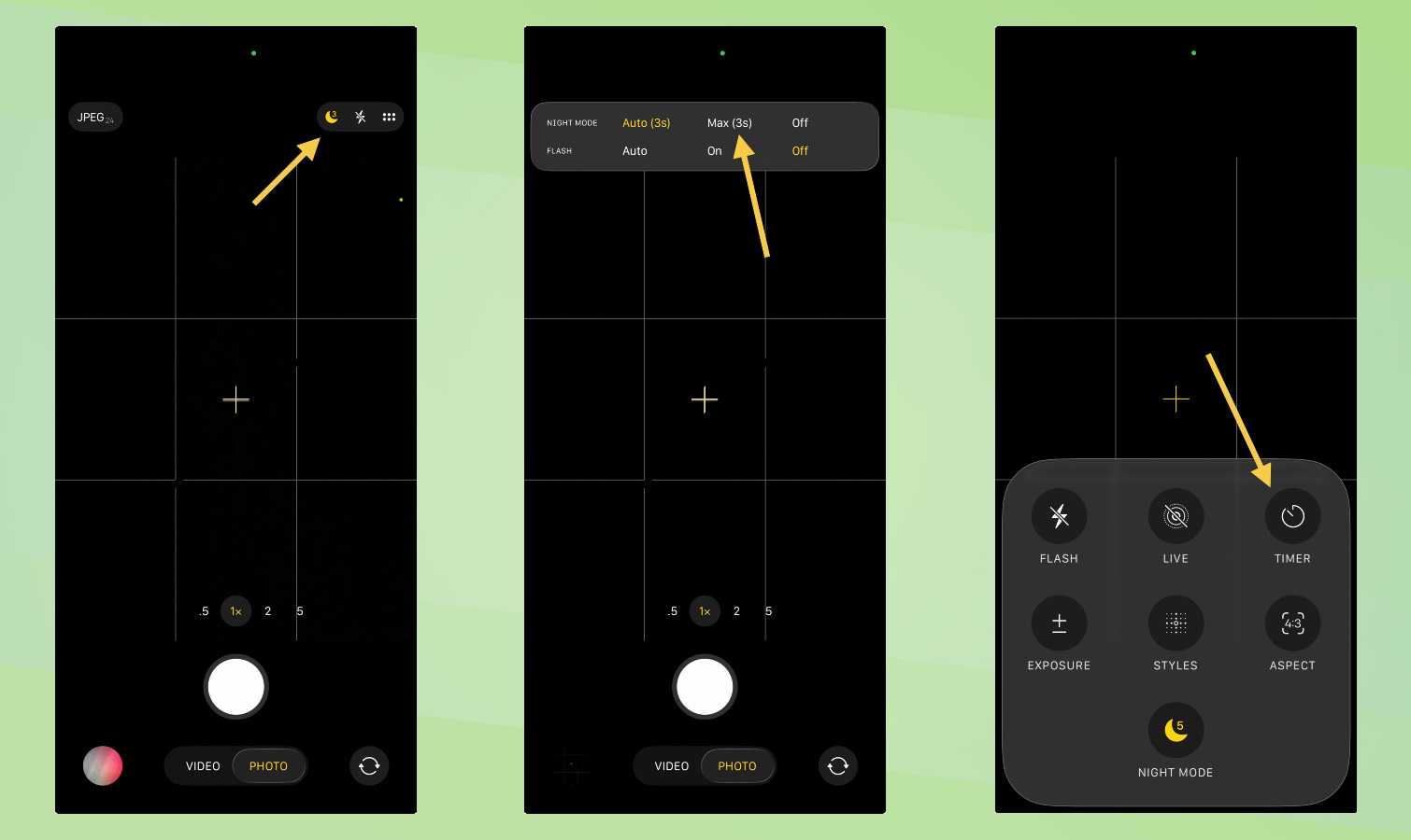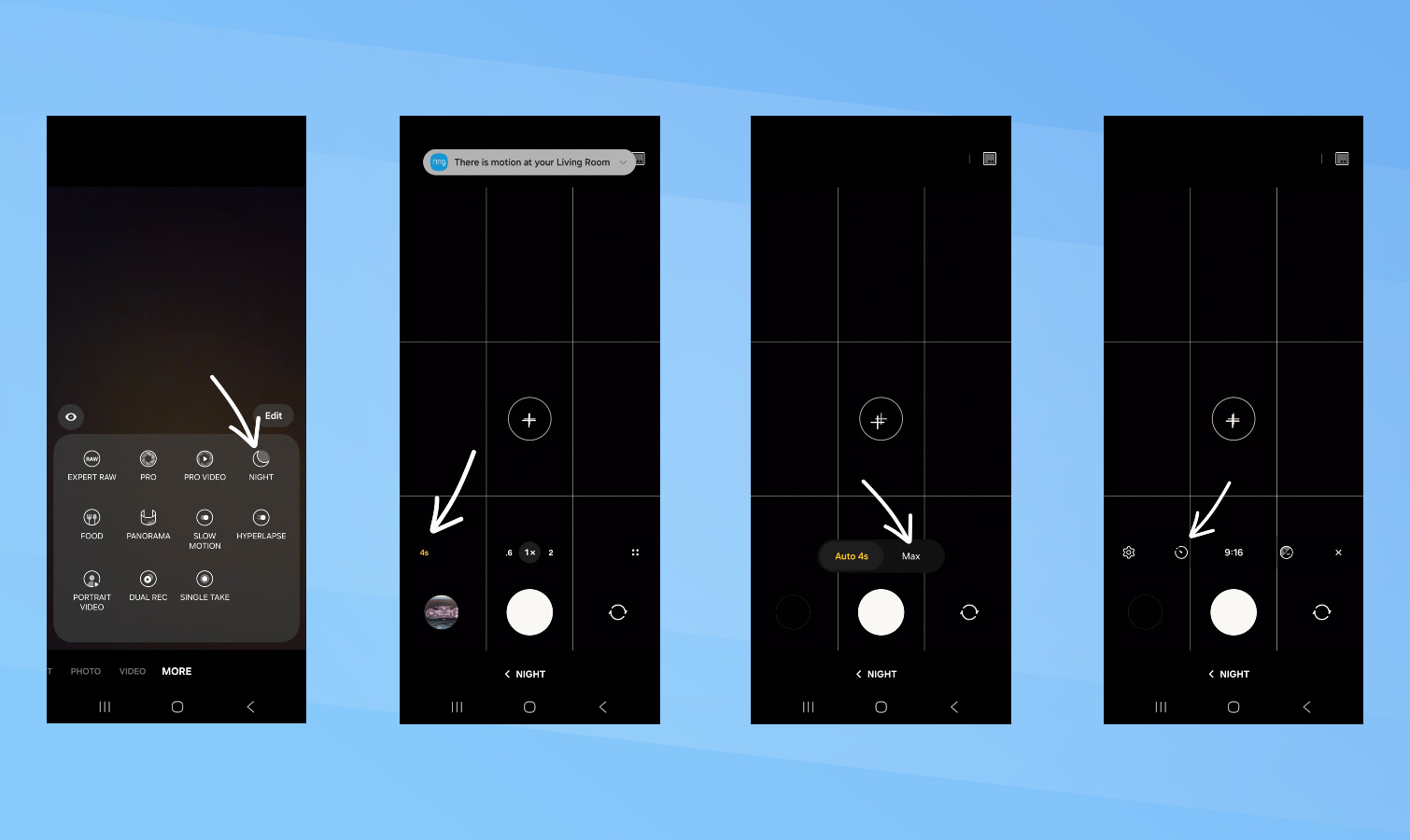 Get to Night mode by selecting the "More" tab all the way to the right of the carousel, then select on the icon for night mode. Once you're in it, you'll want to set the exposure to its longest by tapping on the icon on the left side showing the exposure time, then select max. Finally, you can also set a timer by tapping the four-dotted icon on the right, then select the clock icon to set it.