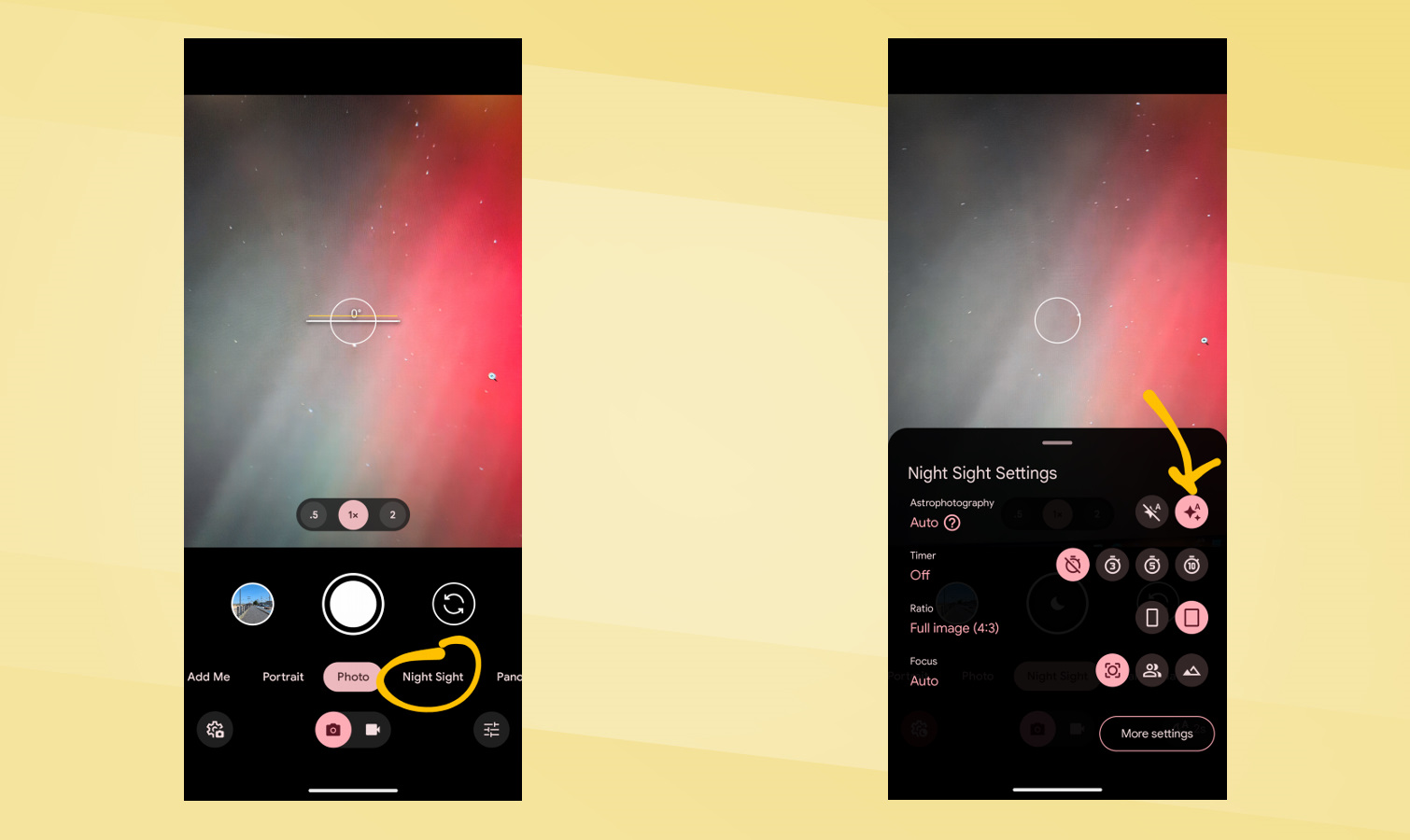 If you’re using a Pixel, you’ll want to select Night Sight mode from the carousel at the bottom of the camera interface, then ensure it’s in astrophotography mode by tapping the gear icon on the bottom left and select the icon with two stars with the letter A on it.