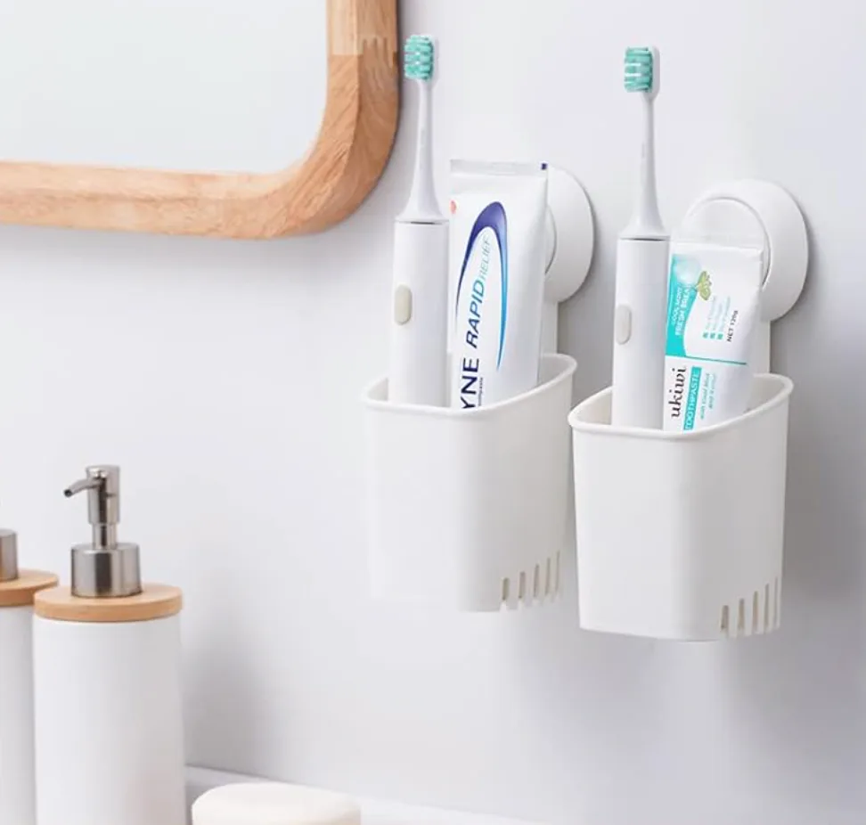 No glue, no drilling, no screws, no adhesives: this self-draining, waterproof cup sticks to glass enclosures, mirrors, tiles, and backsplashes with a strong suction cup that can support up to 11 pounds. Use it to hold toothbrushes above the bathroom sink, toiletries and razors in the shower, utensils in the kitchen, or makeup brushes at your vanity.