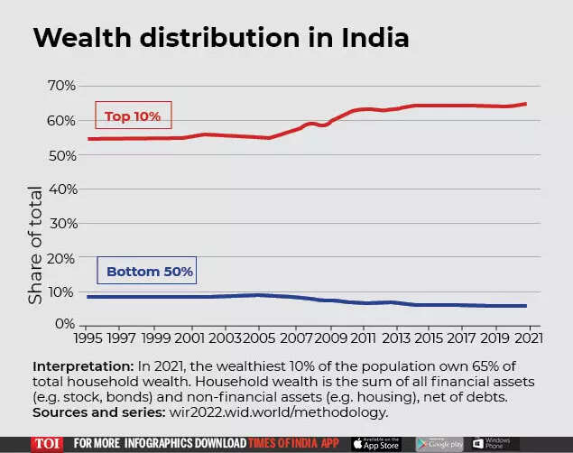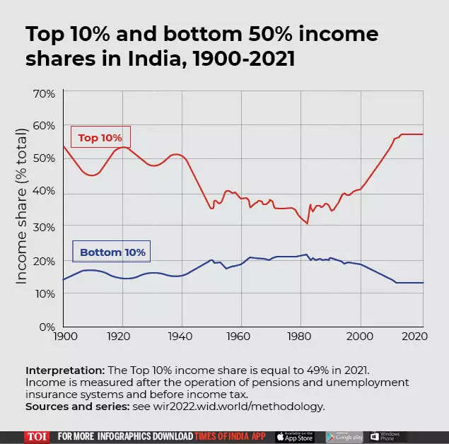 NEW DELHI: Income inequality in India has been a major concern since long. In 2021 as well, the top 1 per cent of the population earned 22 per cent of the country's total national income, while the bottom 50 per cent earned just 13 per cent, the World Inequality Report 2022 showed on Tuesday.