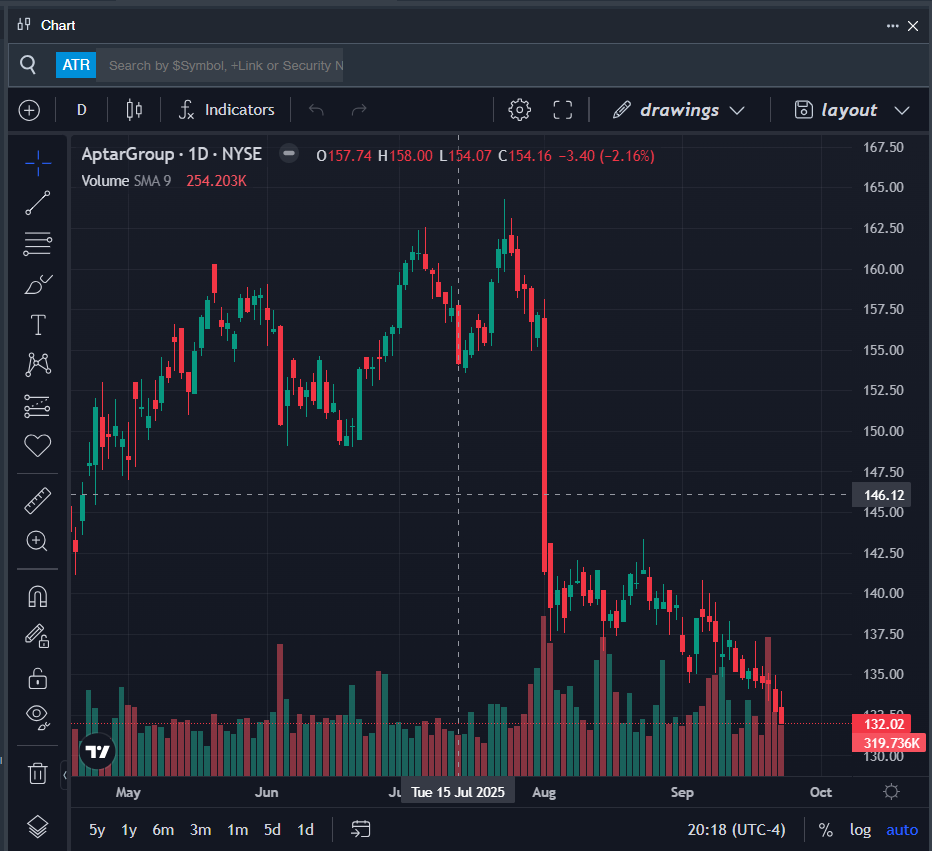 - ATR Price Action: Shares of Aptargroup slipped 0.5% to close at $132.02 on Tuesday.