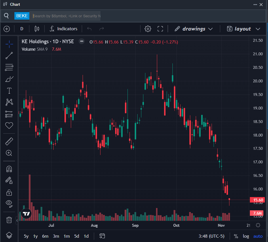 - BEKE Price Action: Shares of KE Holdings fell 1.3% to close at $15.60 on Friday.