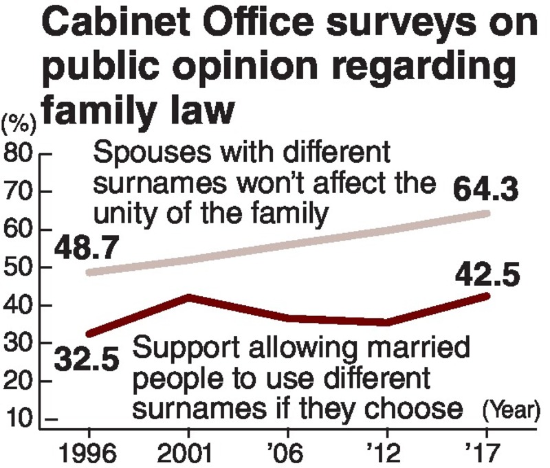 The decision, handed down by Chief Justice Naoto Otani at the court's Grand Bench, came about 5-1/2 years after the bench first ruled that requiring married couples to have the same surnames were constitutional. During this period, local assemblies across Japan have passed more than 100 resolutions calling for the introduction of a system that allows married people to use different surnames if they choose. In a Cabinet Office public opinion survey conducted in 2017, a record-high 42.5% of respondents supported establishing such a system.
