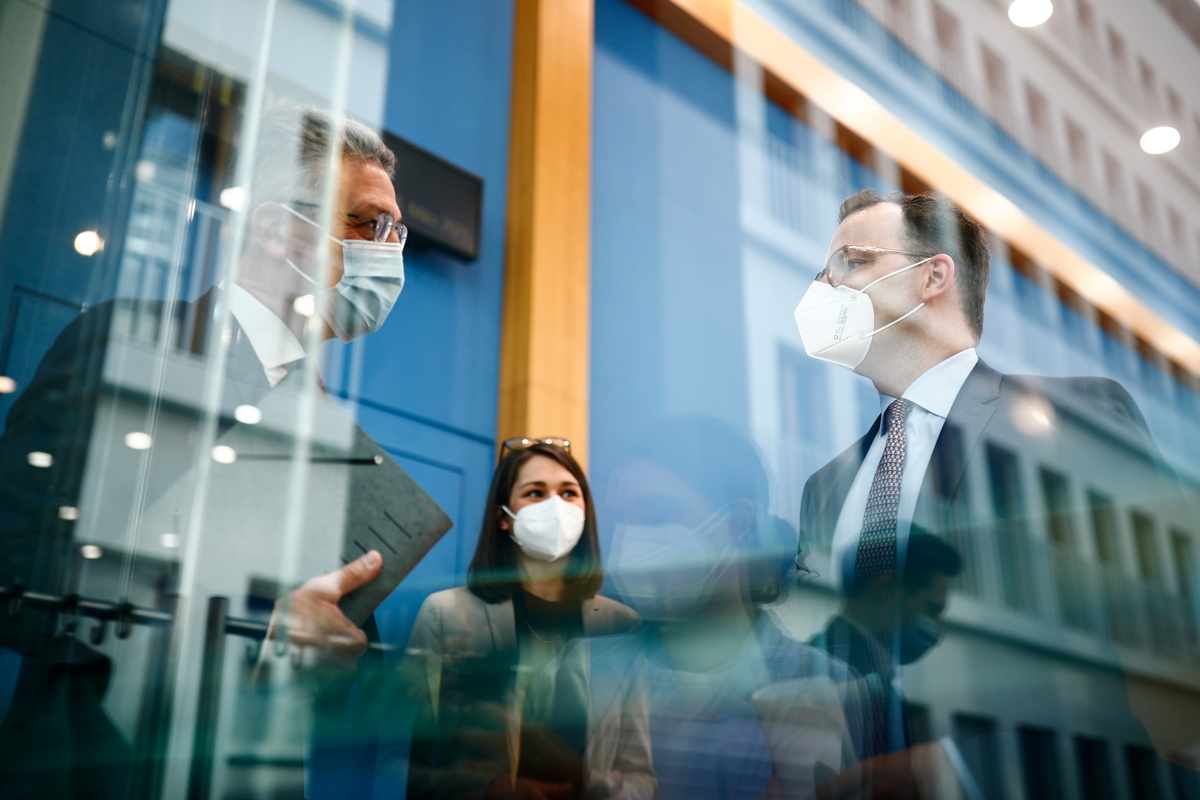 Germany's Health Minister Jens Spahn speaks during a news conference on the coronavirus disease (COVID-19) pandemic in Berlin, Germany March 26, 2021. REUTERS/Hannibal Hanschke/PoolGermany's Health Minister Jens Spahn and Lothar Wieler, the head of Germany's Robert Koch Institute (RKI) for disease control, attend a news conference on the coronavirus disease (COVID-19) pandemic in Berlin, Germany March 26, 2021. REUTERS/Hannibal Hanschke/PoolGermany's Health Minister Jens Spahn and Lothar Wieler, the head of Germany's Robert Koch Institute (RKI) for disease control, talk after a news conference on the coronavirus disease (COVID-19) pandemic in Berlin, Germany March 26, 2021. REUTERS/Hannibal Hanschke/Pool