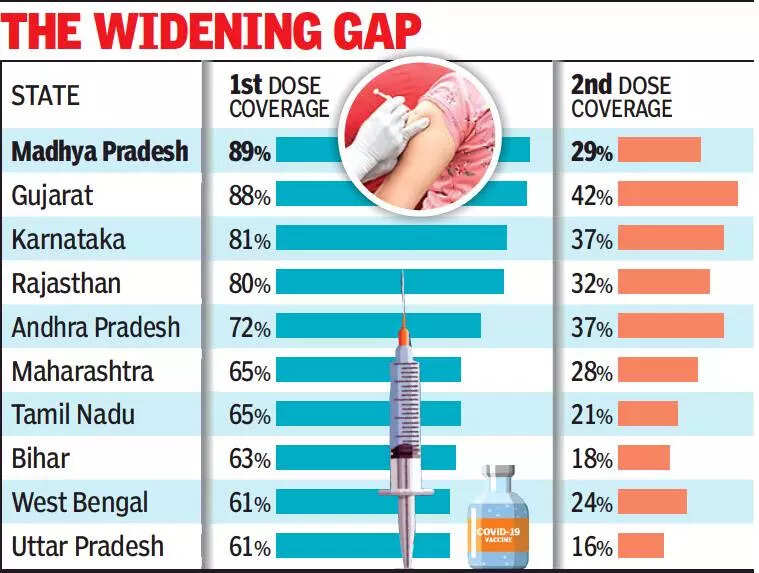 BHOPAL: With 89% coverage, Madhya Pradesh leads the highly populated states when it comes to administering first dose of Covid-19 vaccine. However, it is among low performing states in country when it comes to second dose vaccination. Reason: The slowed down vaccination in this month so far, data shows.