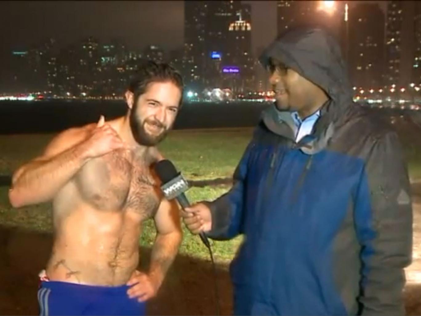 In the segment a WGN TV Chicago news reporter stands in the rain wearing a cagoule and his hood pulled up onto his head, while interviewing a topless Ethan Renoe, who has been out running in a pair of shorts in the unseasonably warm December.