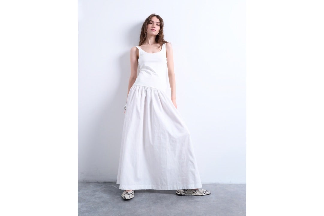 A throw-on-and-go dress to get you through the last few weeks of summer, this poplin maxi is effortlessly stylish. Characterised by its fitted body, drop waist and maxi poplin skirt, the white colourway makes it endlessly wearable. Style with mesh flats or flip flops, before layering with knitted cardigans and trainers in the autumn.