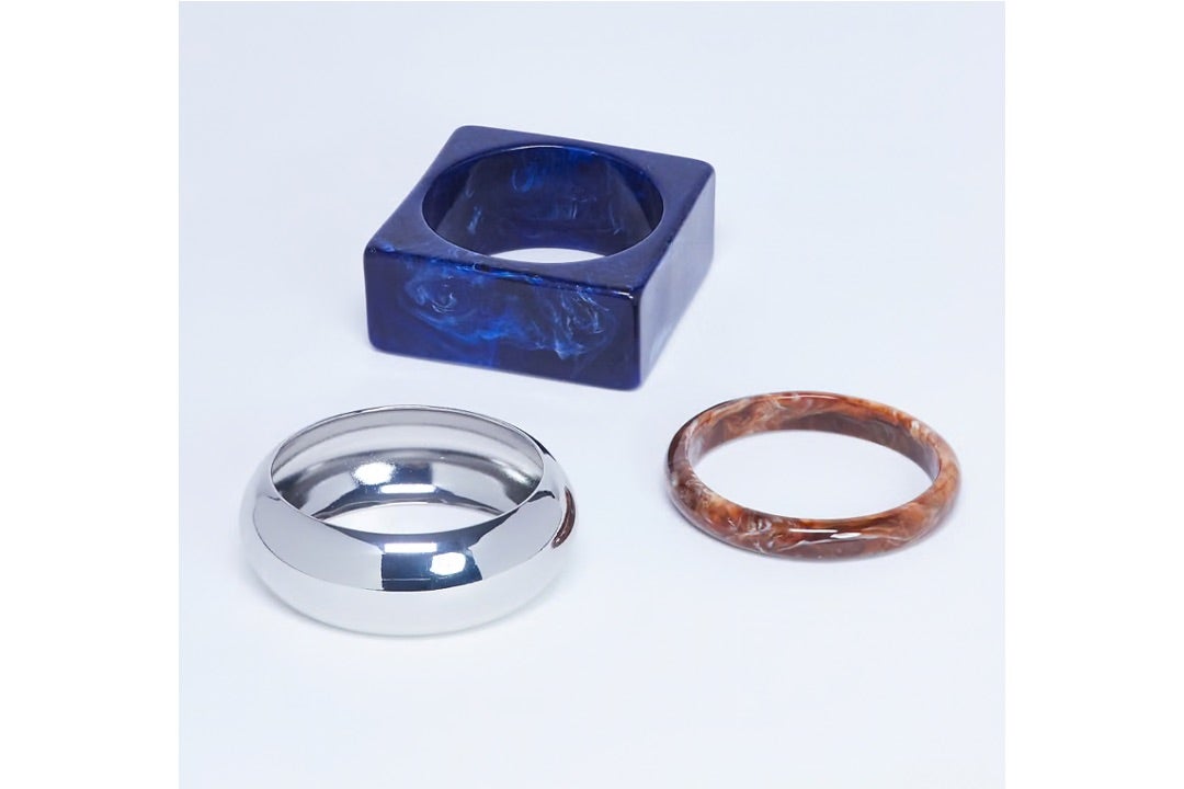 Stacked bangles are the accessories trend to pay attention to this season. As seen on runways and on Bella Hadid, the Nineties jewellery staple is everywhere. Topshop’s affordable pack features a square resin blue style, a brown marbled design and a statement metallic bangle.