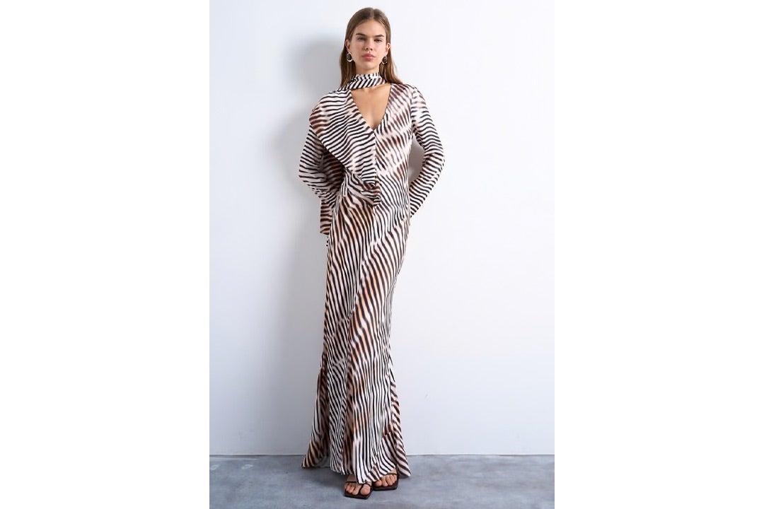 Crafted from woven fabric with an abstract animal stripe print, this show-stopping dress features flattering scarf accent detailing, a V-neckline and long sleeves. Ruffle detailing and a slit up the front add the final flourish, with the floaty maxi dress perfect for elevated evening attire.