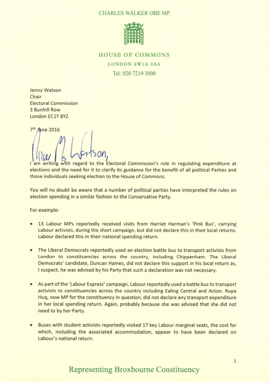 Charles Walker wrote to the Commission on Tuesday arguing that “a number of political parties have interpreted the rules on election spending in a similar fashion to the Conservative party”.