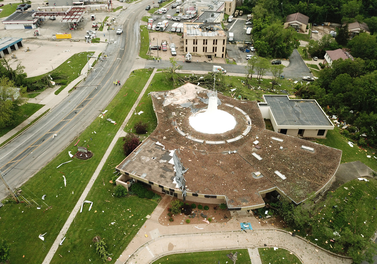 Debris from a damaged building is shown in this aerial photo after a tornado touched down overnight in Jefferson City, Missouri, U.S. May 23, 2019. REUTERS/Drone Base