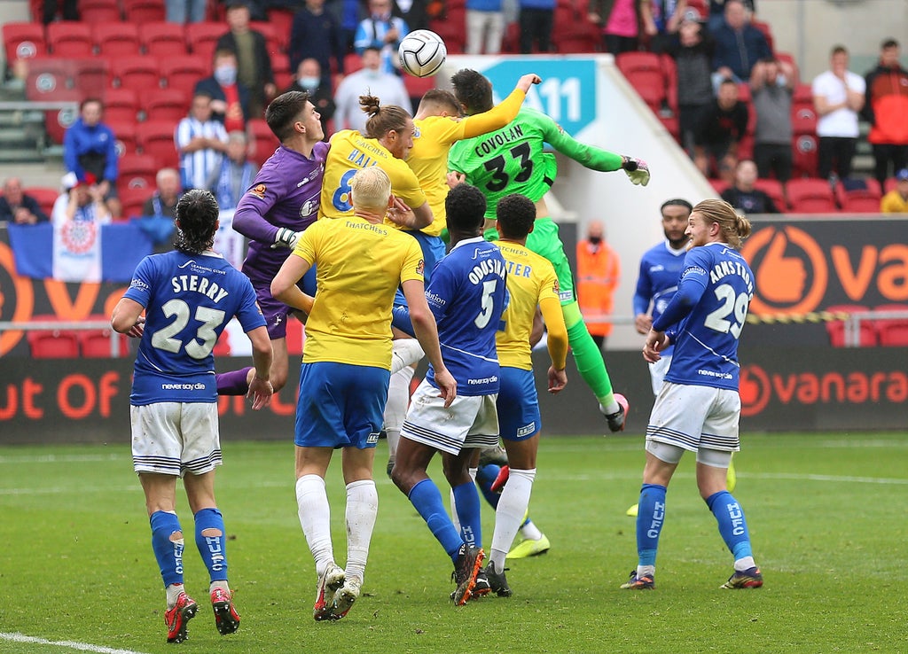 Torquay goalkeeper Lucas Covolan scored a last-minute headed equaliser just as Hartlepool thought they had sealed promotion to Sky Bet League Two in Sunday’s National League play-off final.
