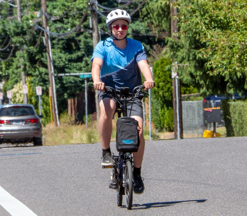After I got used to the dual-lever rear transmission system, it was easy to get up to speed on the Brompton, which means a top speed of about 16mph according to the app. While Class II bikes in the U.S. top out at 20mph, in England and the EU in general it’s 18mph and really, 16mph is a solid clip on a bike with smaller wheels like the Brompton, and in general, most bike commuters rarely average more than 10mph on pedal power, so while no speed demon, it does get you down the road more quickly (and likely much farther) than the just pedaling. The Brompton does not have a throttle mode as it only offers pedal assist, but the 250-watt motor in the front wheel purred right along on Portland streets - and also made climbing the monster hills in San Francisco possible.
