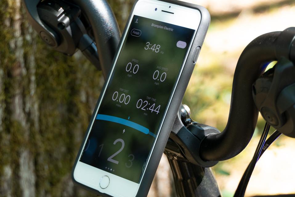 One other difference from the non-electric models include using your smartphone as the bike’s speedometer and motor power controller. However, the bike can also be used without it, and you can adjust motor output across four levels (including zero), power it up and down and control the lights with buttons on the battery pack. There’s also a hidden USB port for charging your phone or other gear. Brompton included a quick-mount phone holder for my iPhone for the review.