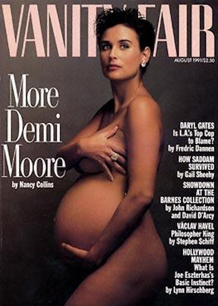 Now, images of pregnancy and childbirth are significantly more visible and varied. A watershed moment came in 1991 when Annie Leibovitz’s impactful (and controversial) portrait of Demi Moore – naked, beatific, and 7 months pregnant – graced the front cover of Vanity Fair. It challenged the notion that pregnant bodies should be hidden.