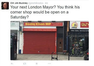Jim Buckley tweeted a photograph or Mr Khan’s constituency office with its shutters down and commented: “Your next London Mayor? You think his corner shop would be open on a Saturday?”