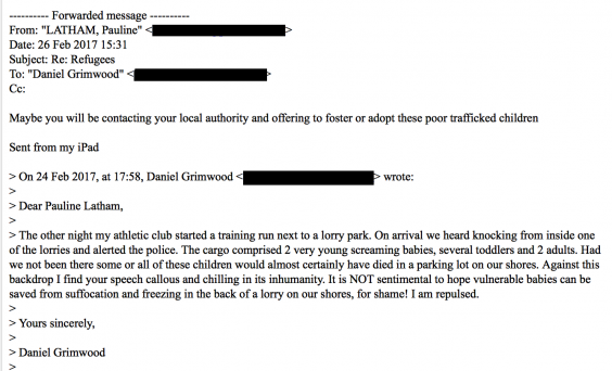 Daniel Grimwood, 40, wrote to Tory MP Pauline Latham after he heard her speech rejecting the need to give sanctuary to child refugees. He recounted a story of how he and his friends had heard banging coming from within a lorry while they were out jogging, leading them to alert the police.