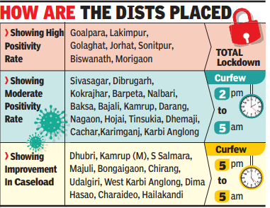 In 16 other districts showing moderate test positivity rates, curfew will be clamped from 2 pm to 5 am. Among these three districts, Dibrugarh, Tinsukia and Sivasagar, where an upward trend of positive cases has been observed, will be under close watch.