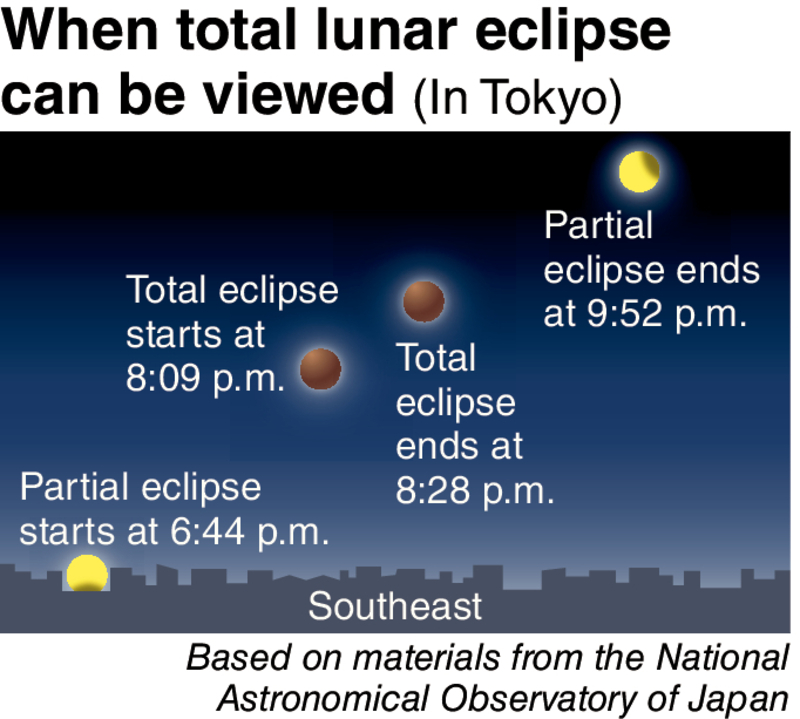 A partial eclipse will begin at 6:44 p.m. on Wednesday, with a total eclipse of the moon falling completely into the earth's shadow occurring between 8:09 p.m. and 8:28 p.m., according to the National Astronomical Observatory of Japan (NAOJ). In some regions, such as Hokkaido, the Tohoku region and western Japan, the moon will rise on the wane.