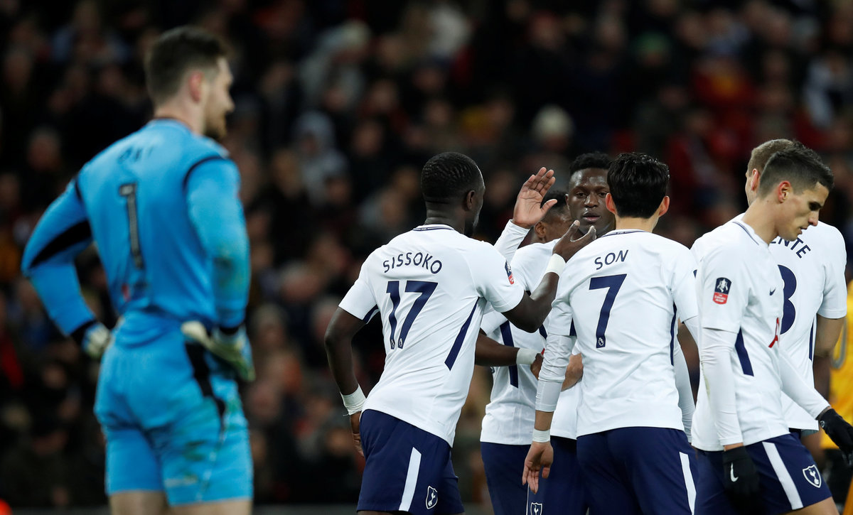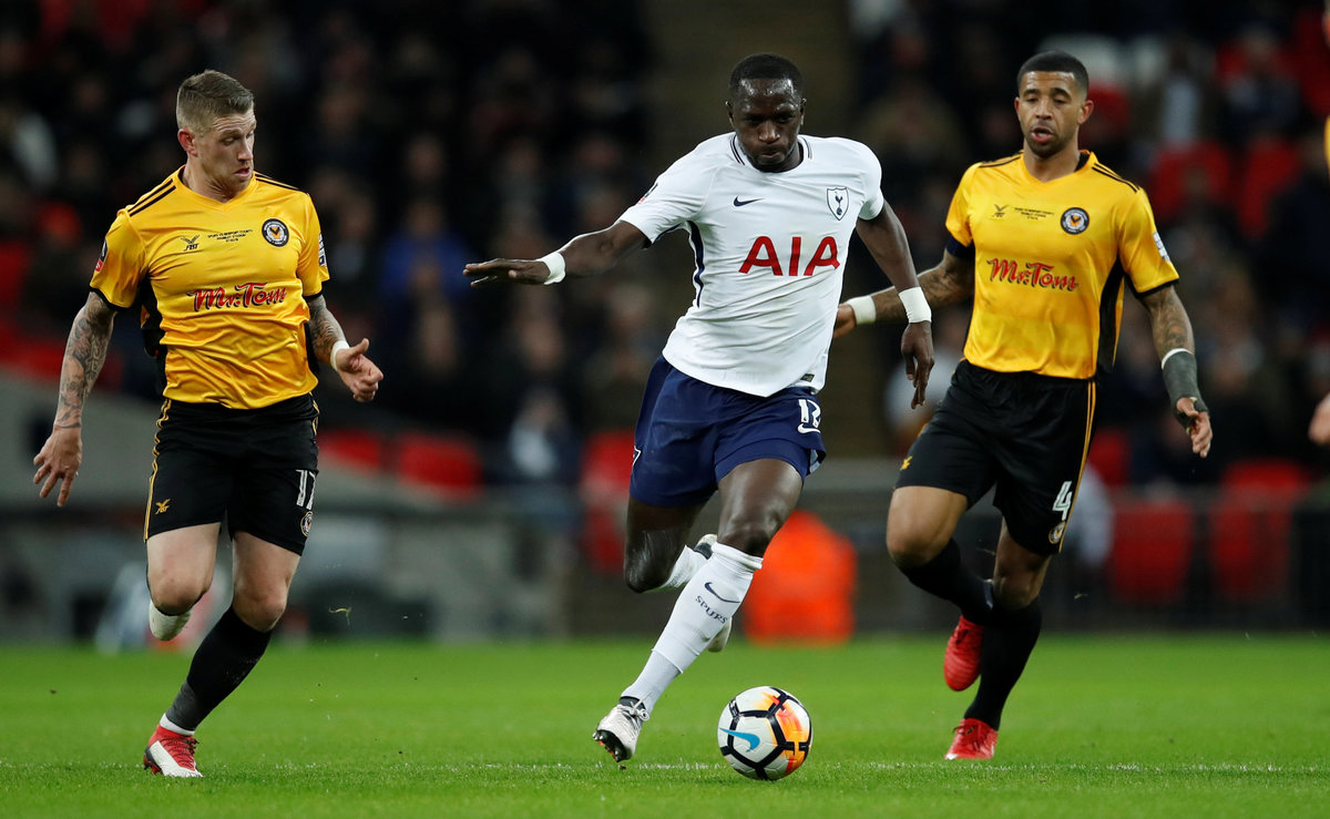 Soccer Football - FA Cup Fourth Round Replay - Tottenham Hotspur vs Newport County - Wembley Stadium, London, Britain - February 7, 2018 Tottenham's Moussa Sissoko in action with Newport County's Scot Bennett and Joss Labadie REUTERS/Eddie KeoghSoccer Football - FA Cup Fourth Round Replay - Tottenham Hotspur vs Newport County - Wembley Stadium, London, Britain - February 7, 2018 Tottenham's Moussa Sissoko celebrates with teammates after Newport County's Dan Butler (not pictured) scores an own goal and the first for Tottenham REUTERS/Eddie Keogh