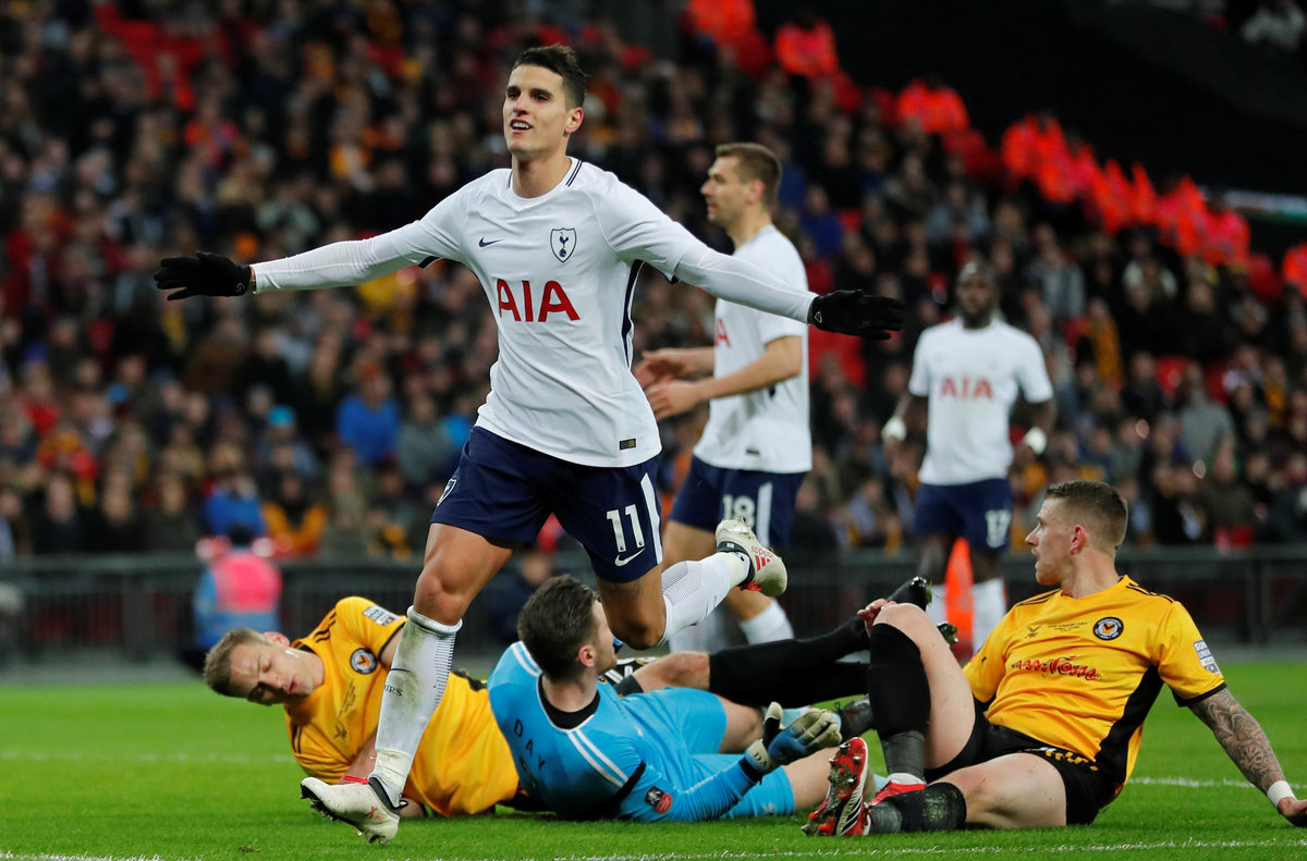 Soccer Football - FA Cup Fourth Round Replay - Tottenham Hotspur vs Newport County - Wembley Stadium, London, Britain - February 7, 2018 Tottenham's Erik Lamela celebrates scoring their second goal REUTERS/Eddie Keogh