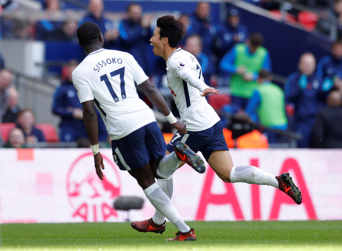 Soccer Football - Premier League - Tottenham Hotspur vs Crystal Palace - Wembley Stadium, London, Britain - November 5, 2017 Tottenham's Son Heung-min celebrates scoring their first goal with Moussa Sissoko Action Images via Reuters/Andrew Couldridge