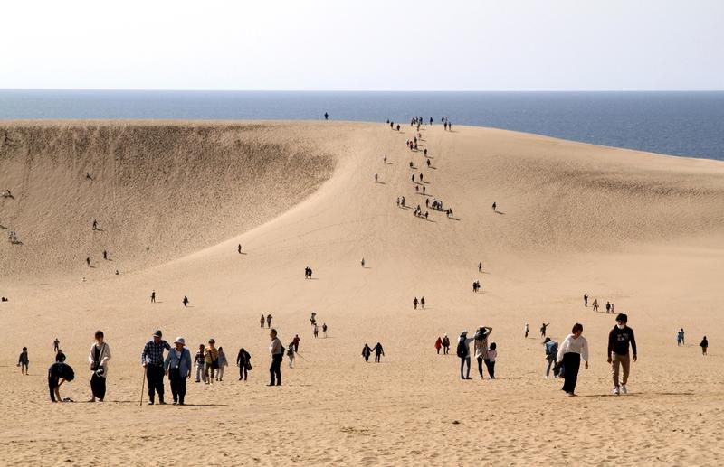 TOTTORI -- The seawater's dark blue and the sky's light blue spread out beyond the beige of the dunes. The Tottori Sand Dunes' magnificent panoramic landscape overwhelmed me with its natural layers of color, which made me forget for a moment that I was in Japan.