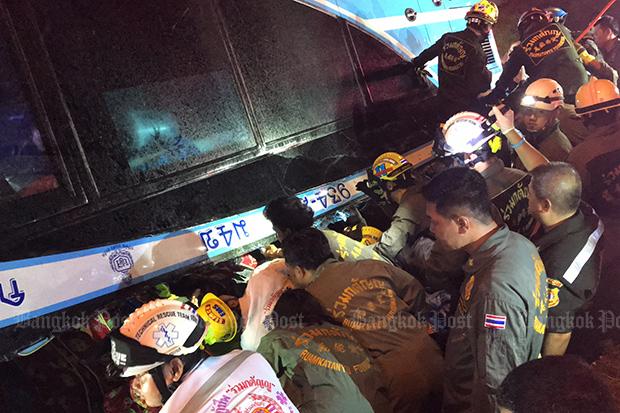 A police investigation revealed that the bus of Prayad Tour Company departed Phanom Phrai district in Roi-et province at 7pm on Saturday. Passengers said the accident happened in the rain after the driver braked suddenly to avoid hitting a vehicle in front of it, causing it to overturn and come to rest in the road median ditch upside down.