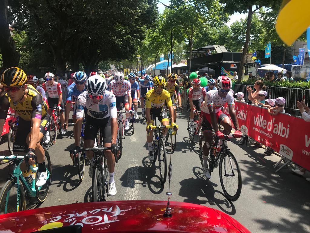 Twitter“🚴♂️ The peloton is off for the départ fictif through the roads of Albi. 🚴♂️ Le peloton est dans le départ fictif, dans les rues d'Albi. #TDF2019”