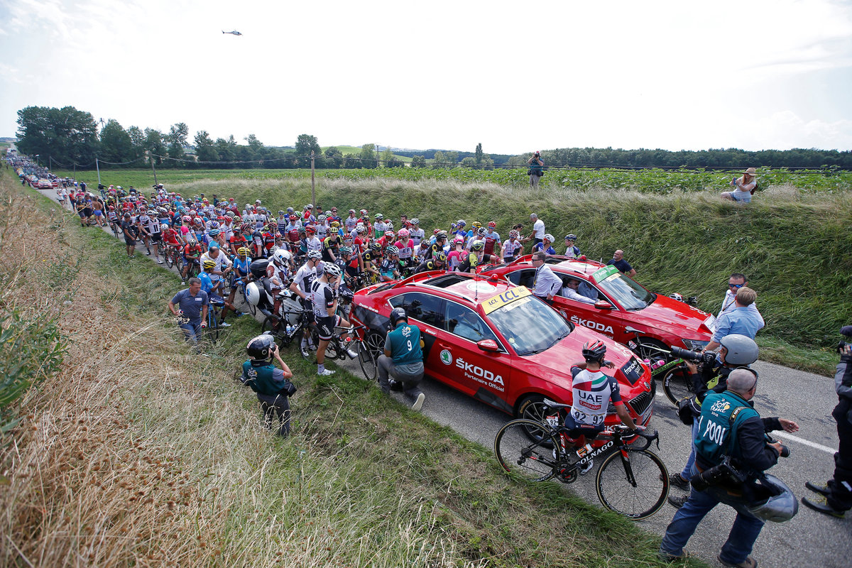 Yellow jersey holder Geraint Thomas and world champion Peter Sagan were among the riders rinsing their eyes as the stage was stopped for 15 minutes.