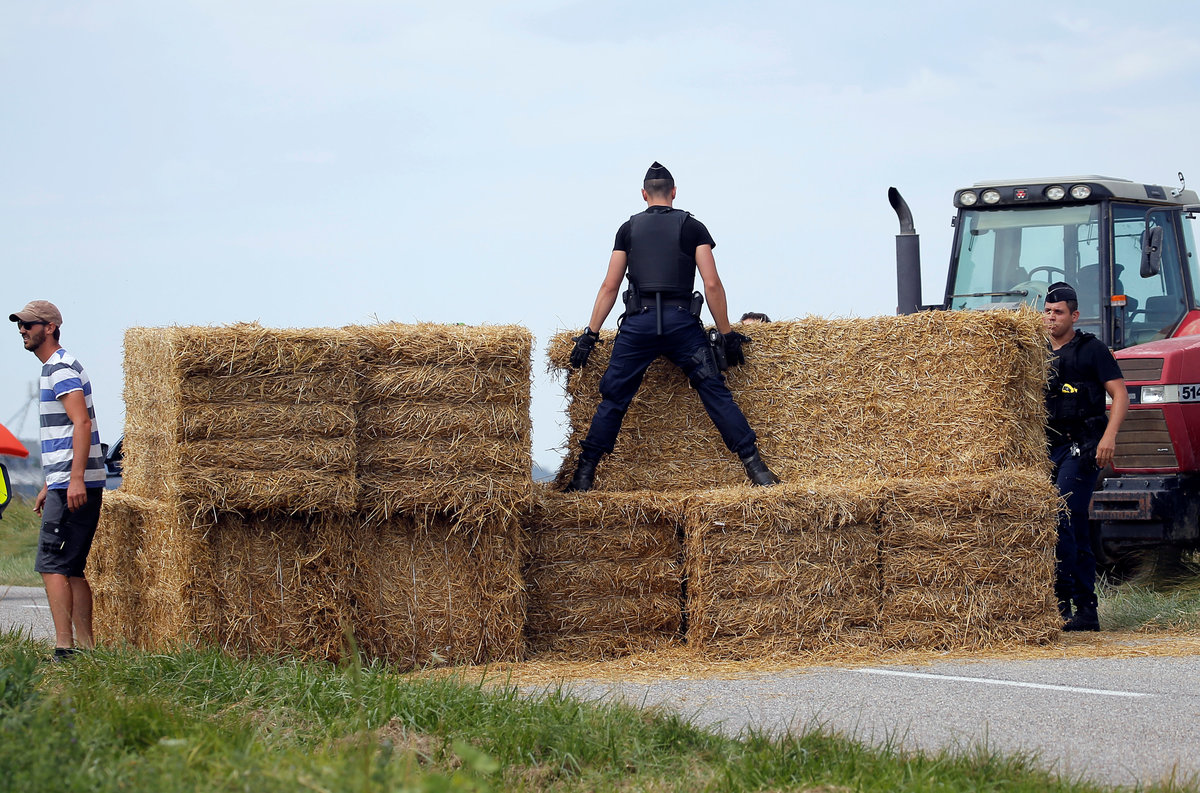 Cycling - Tour de France - The 218-km Stage 16 from Carcassonne to Bagneres-de-Luchon - July 24, 2018 - Police officers remove hay bales off the road after a protest. REUTERS/Stephane Mahe