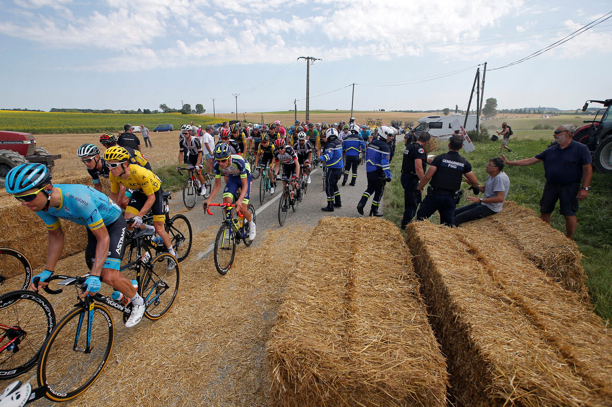 Cycling - Tour de France - The 218-km Stage 16 from Carcassonne to Bagneres-de-Luchon - July 24, 2018 - The peloton passes hay bales after a protest. REUTERS/Stephane Mahe