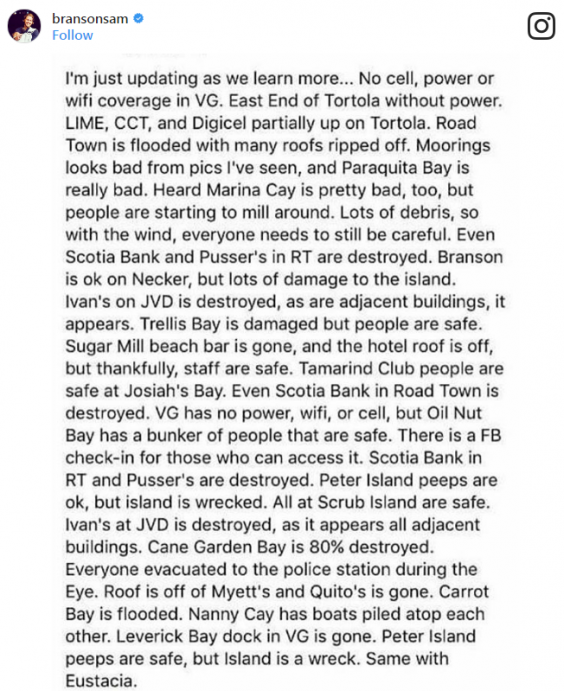 Following the storm's hit on the island, a spokesperson for the Virgin Group told Business Insider: "Virgin Limited Edition can confirm that on the 6th September 2017 Necker Island sustained extensive damage as a result of Hurricane Irma. There were no guests on Island at the time and all staff staying on Island have been accounted for as safe and well."