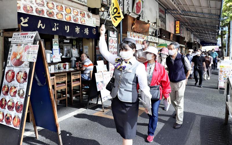 Hato Bus Co., a major bus tour company, offered a tour on the same day in which participants visited tourist areas such as Tsukiji and Asakusa, as well as Shibamata, Katsushika Ward, where the movie series "Otoko wa Tsuraiyo" (It's tough being a man) was set. The tour, with capacity of 28 participants, was fully booked. At Tokyo Station, the tour's departure point, the participants received discount coupons for use at souvenir shops and elsewhere. They boarded the bus after having their temperatures taken and disinfecting their hands.