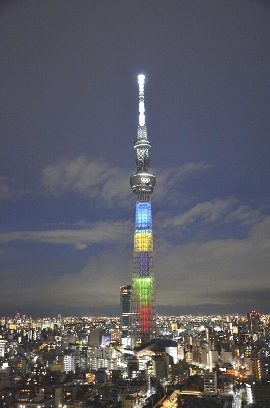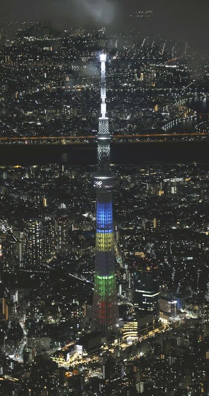 The Tokyo Skytree is getting into the Olympic spirit, with the tower in Sumida Ward illuminated in the five Olympic colors and the Olympic logo lit up on the observation deck.
