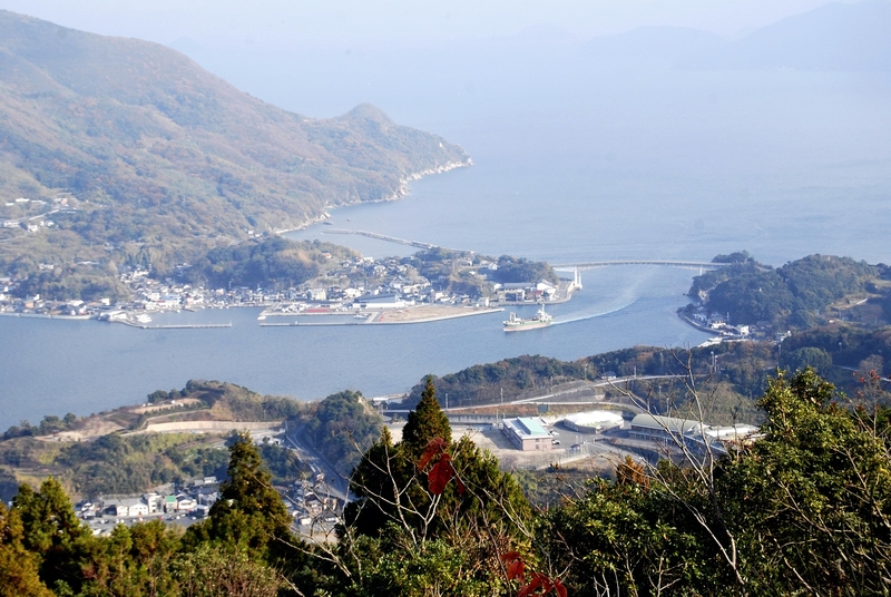 From the top of the mountain, I saw the strait and the Kaminoseki Ohashi bridge. As I watched a ship passing under the bridge, leaving a white trail in the water, I lost all track of time.