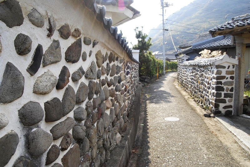 In a small flat area beside the sea, houses of low stature stand closely packed in lines. Their outer walls, called nerihei, made of mud and stones piled up and solidified with plaster, have an impressive appearance.